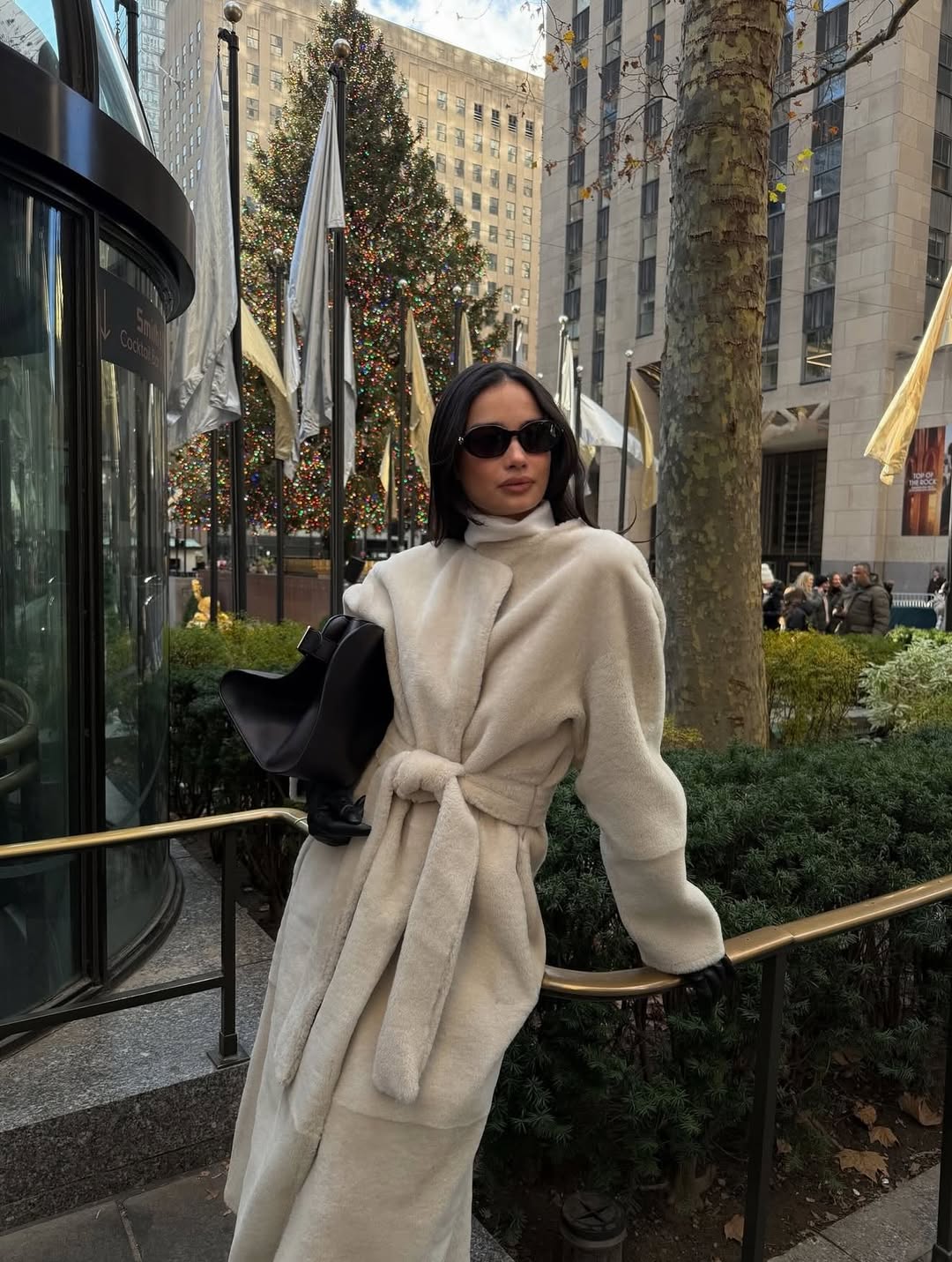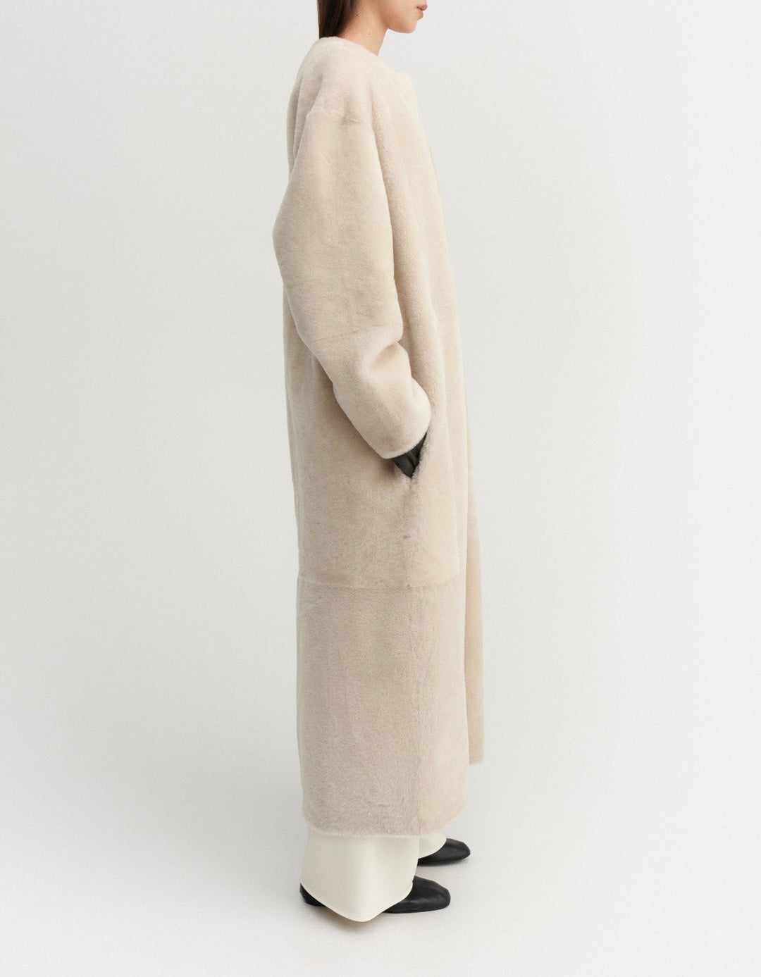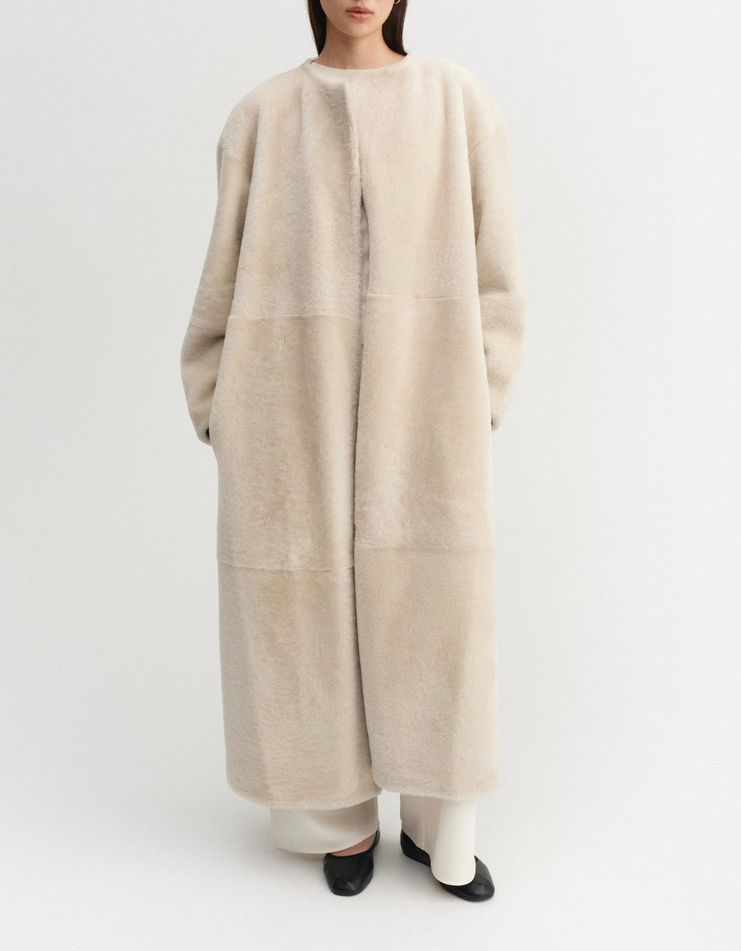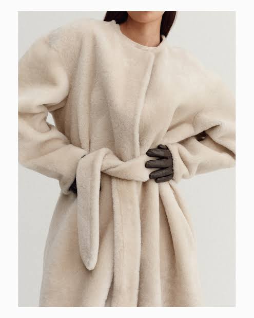 Almada The Label’s affection for understatement naturally allows the quality of its fabrics to take centre stage — the Shea coat included. Crafted exclusively from hand-inspected sheep shearling, it features a sleek round-neck silhouette and a tonal belt that ensures continuity, maintaining the allure of its refined handle throughout. Designed for a relaxed slightly