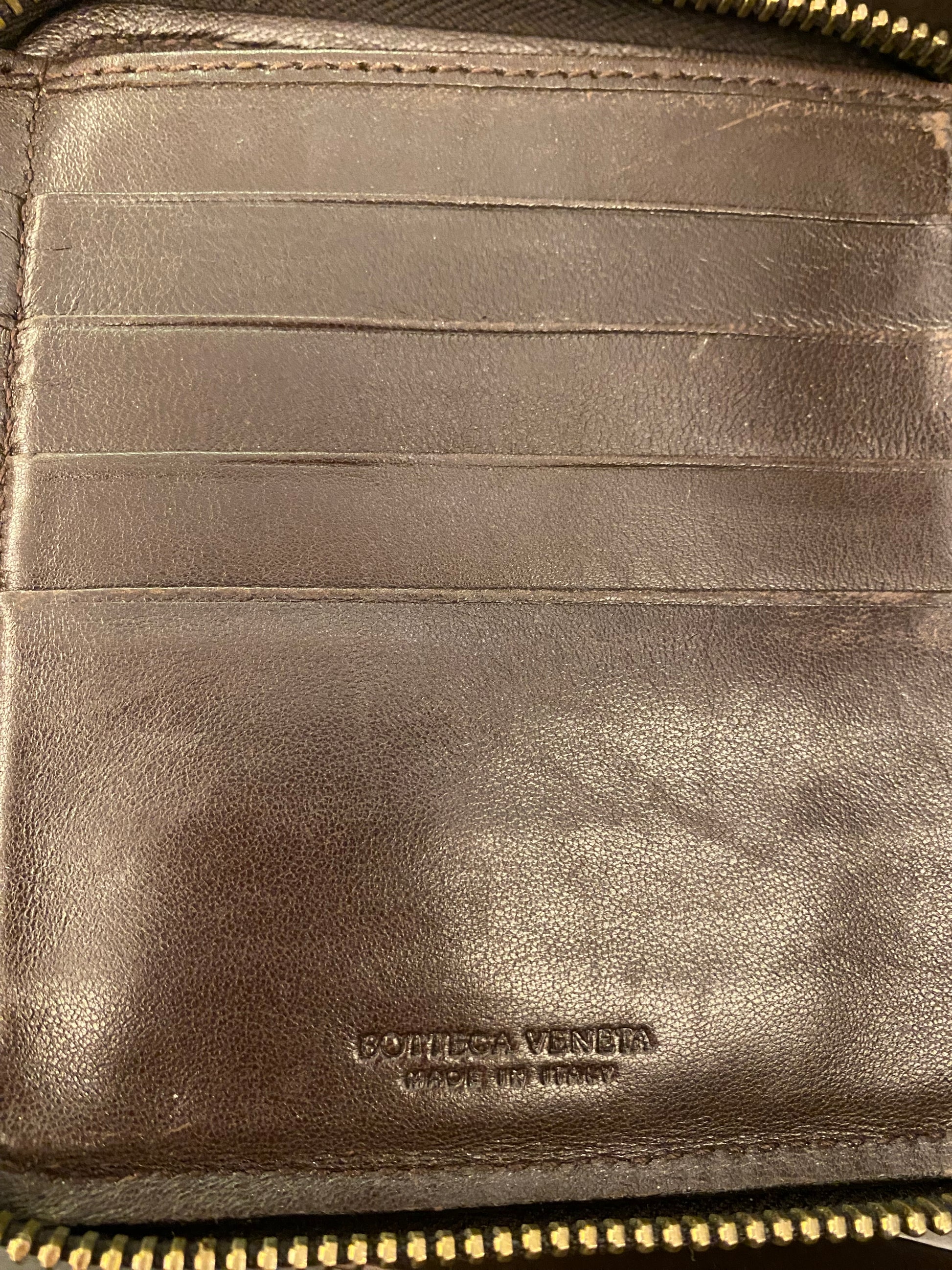 The zip-around closure opens to a well-organized interior with multiple card slots, compartments for bills, and a secure coin pocket. The rich brown leather interior is subtly stamped with the Bottega Veneta logo, reflecting the brand’s renowned Italian craftsmanship and attention to detail.