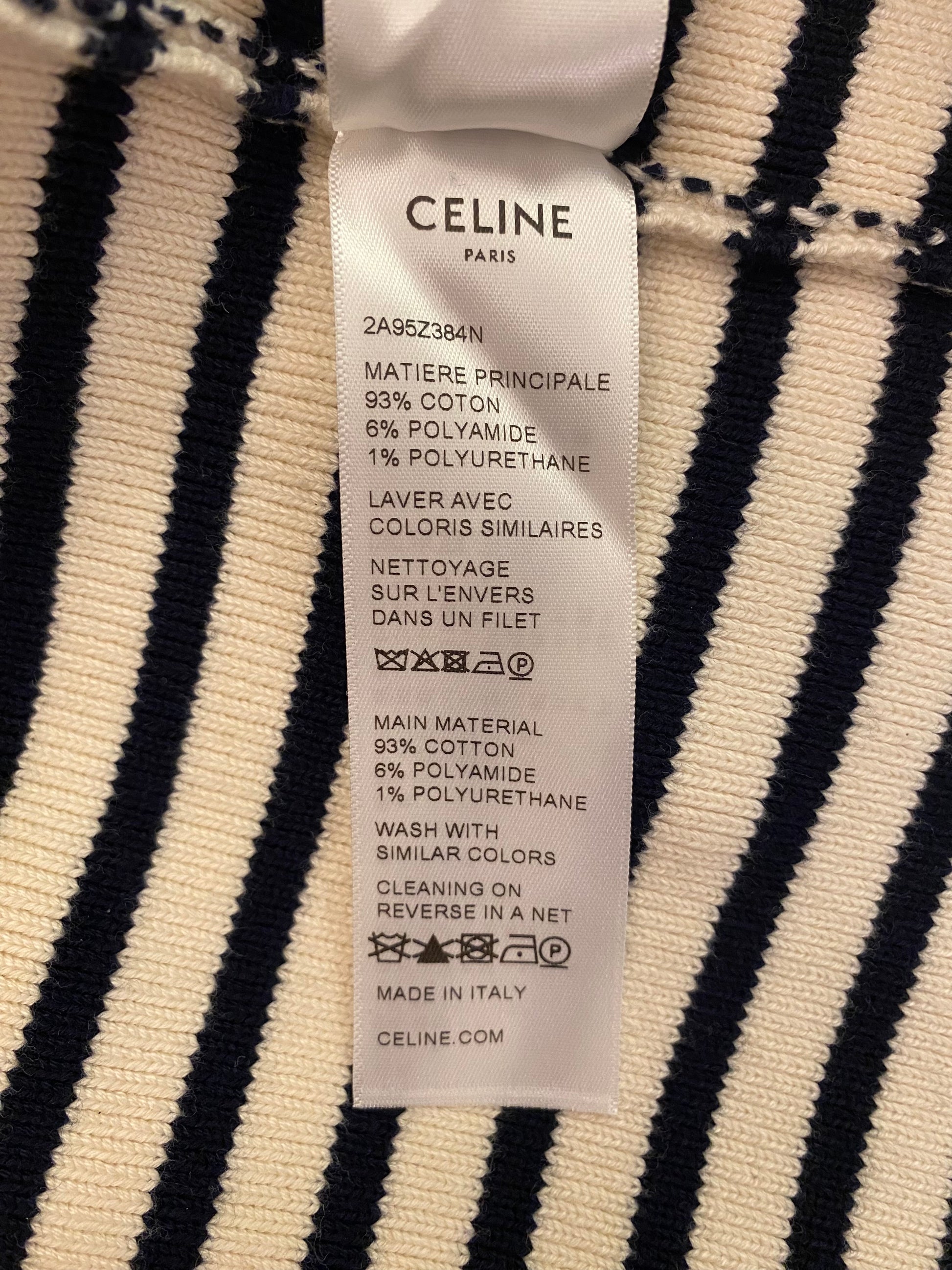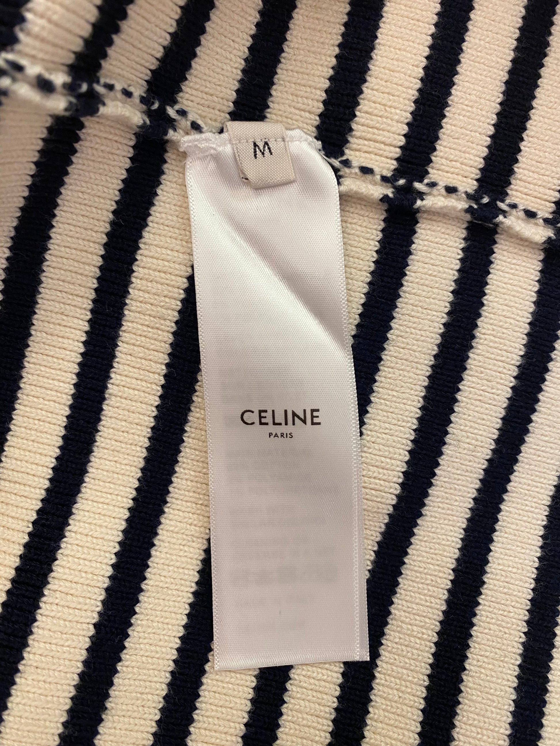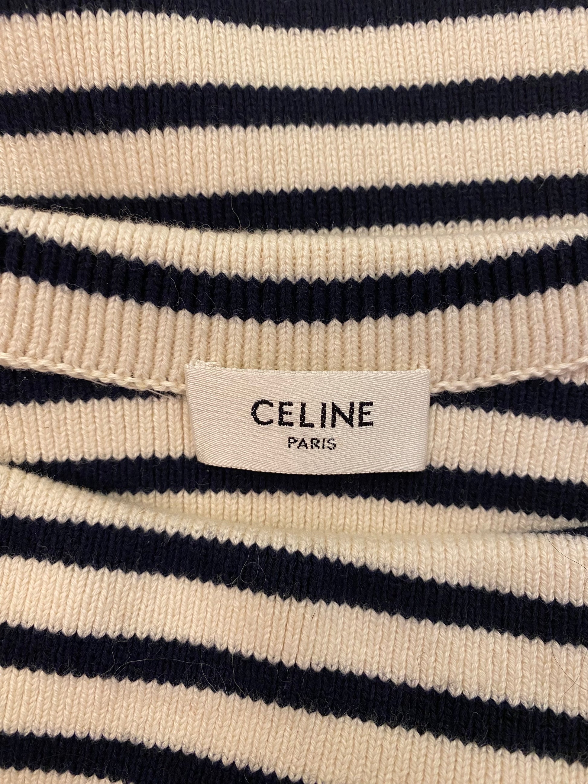 The Black/White Striped Logo Boatneck Sweater is a luxury knit pullover from the French fashion house Celine, featuring a classic boat neckline, bold horizontal stripes in black and white tones, and the brand’s signature logo on the front.