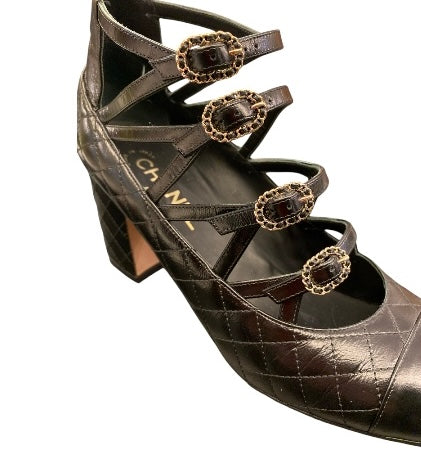 Elevate your wardrobe with these timeless CHANEL heels, crafted from luxurious black quilted leather and designed with elegant multi-strap detailing. The feminine silhouette features delicate buckle closures across the foot, a supportive block heel, and the iconic CC logo accent at the back for a signature finish. Perfect for both day and evening wear, these heels combine classic Parisian sophistication with modern comfort.