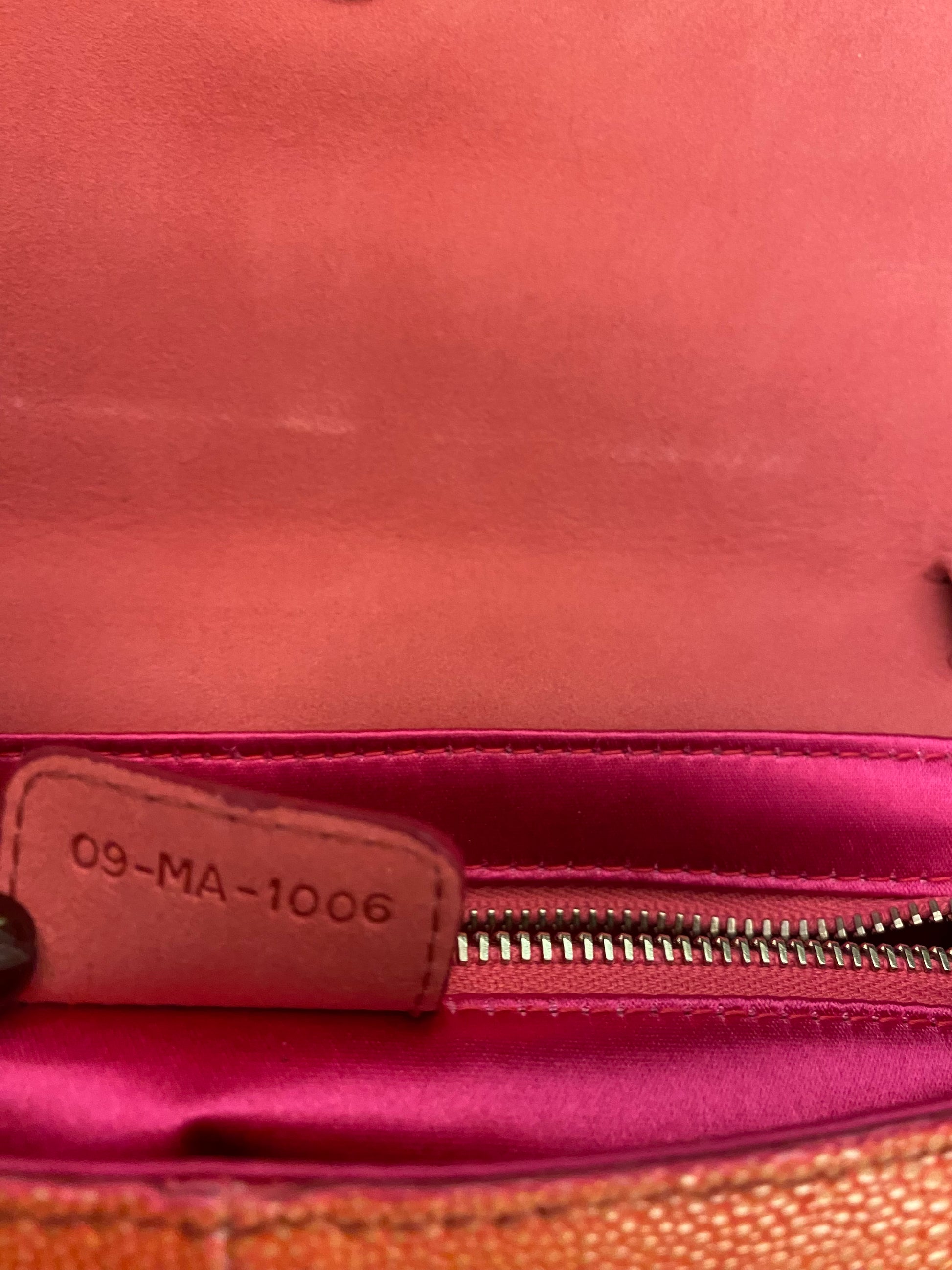 Unique vintage Dior saddle clutch in pink and beige with silver details.