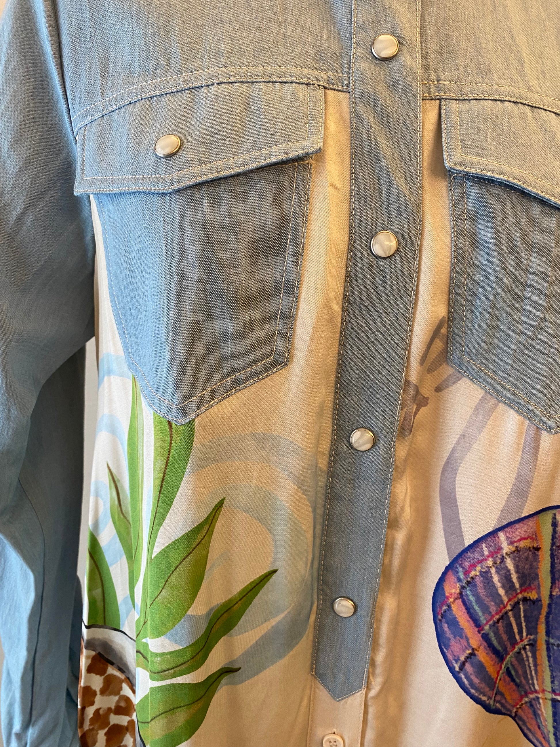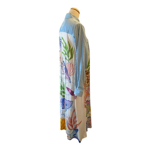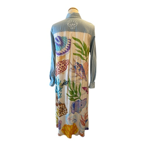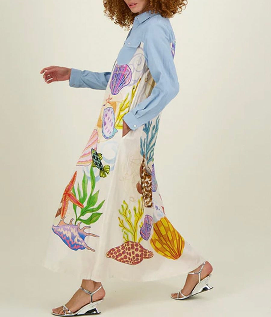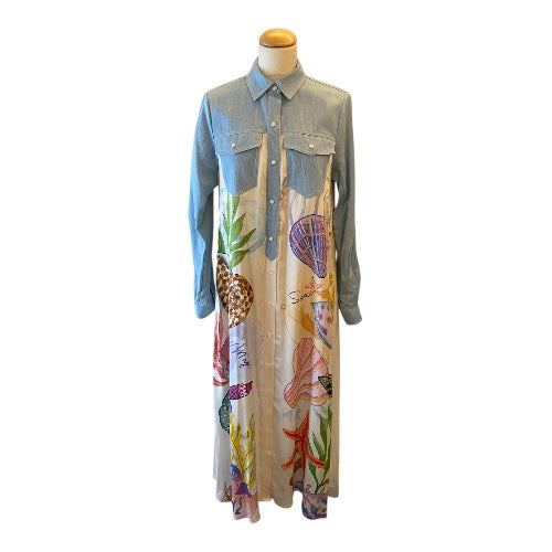 Flowing from the waist, the dress transforms into a soft, lightweight fabric adorned with vibrant, nature-inspired prints - bringing color, movement, and personality to the look. The contrast between the structured denim top and the fluid printed skirt creates a modern, effortlessly chic silhouette.