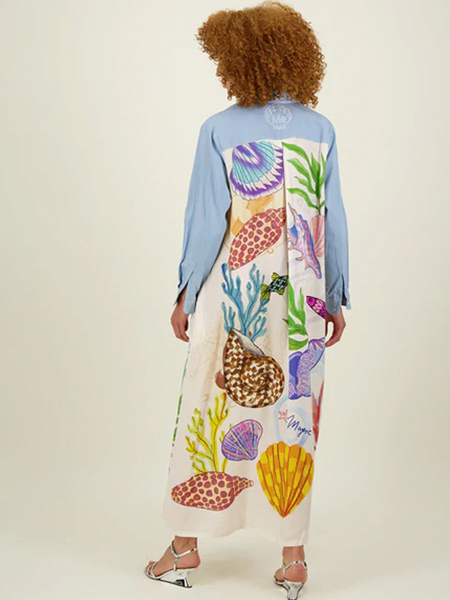A unique fusion of casual denim and artistic elegance, the Elena Magic Combined Dress is designed to stand out. The upper features a classic light-wash denim shirt silhouette with a structured collar, button-down front, and chest pockets, offering a timeless, relaxed feel.
