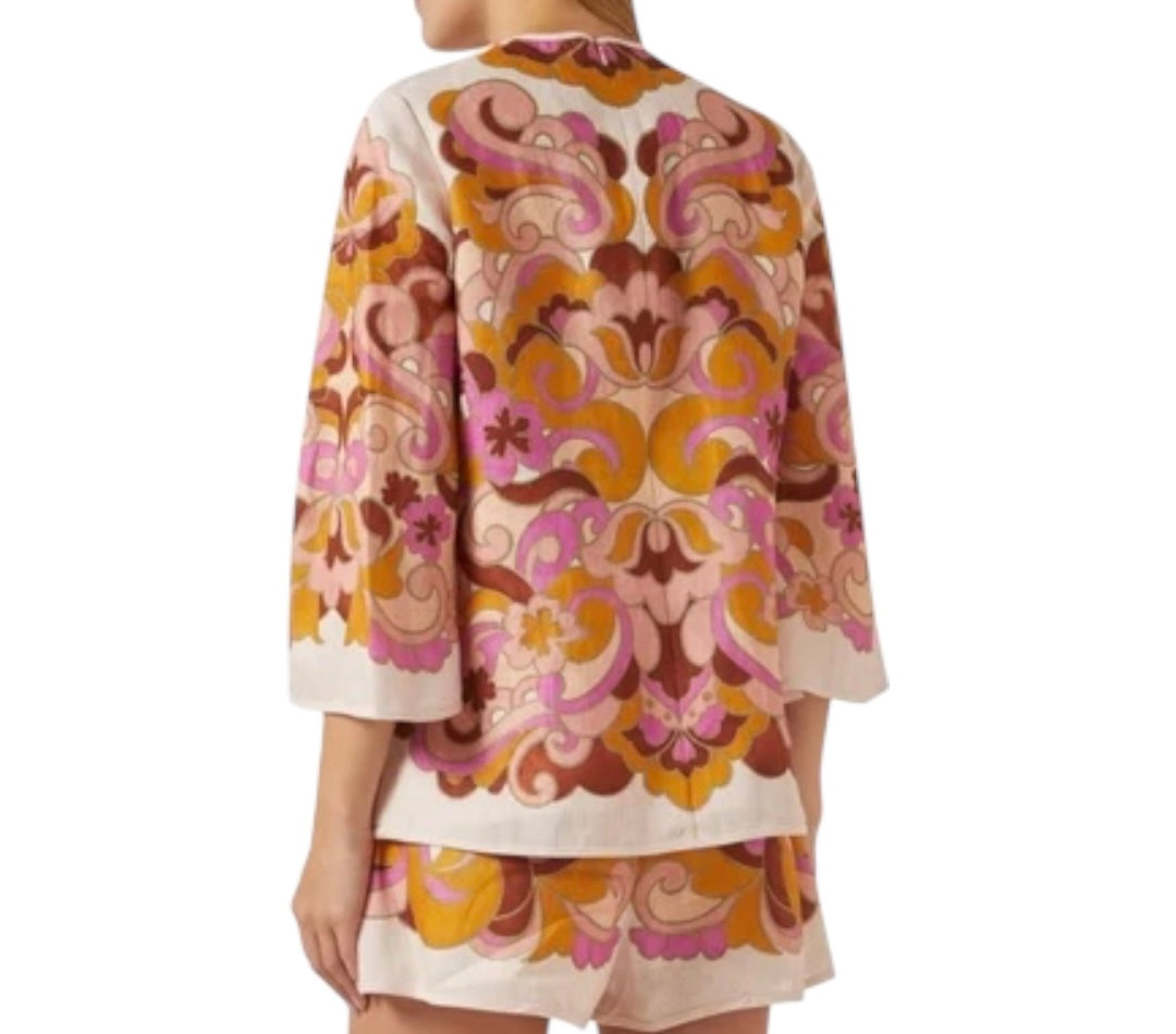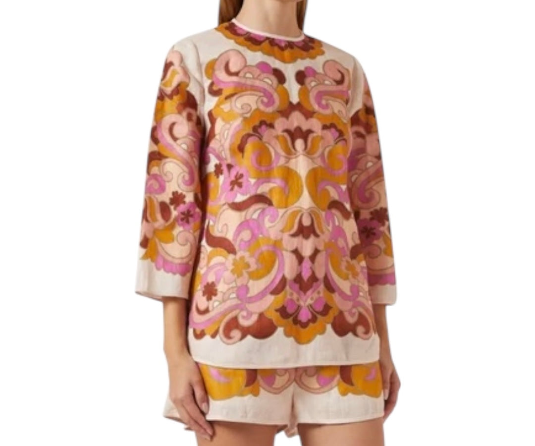 Acadian Paisley-print Tunic Top & Shorts in whisper-weight linen. A retro-tinged paisley pattern runs across its flared sleeves and tunic fit, ensuring that although relaxed in silhouette.